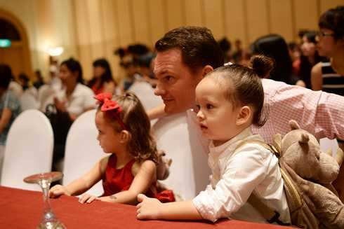 | Trong lúc Hồng Nhung với các nghệ sỹ khác giới thiệu về Monsoon Festival thì thì chồng cô đảm nhận nhiệm vụ chăm sóc 2 con |
