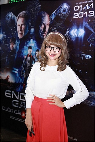 Lan Phương xinh đẹp với chân váy đỏ và sơ mi trắng trẻ trung như nữ sinh, nhưng bộ tóc giả trông quá giả kèm chiếc bờm khiến cô trông như ma nơ canh.