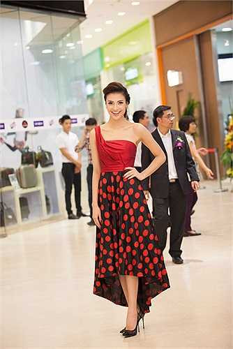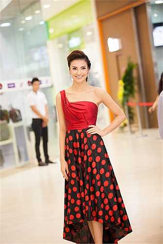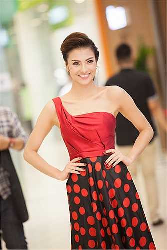 Chọn cho mình thiết kế váy xoè với áo lệch vai, Hồng Quế xuất hiện với vẻ dịu dàng nhưng vẫn phô diễn được những ưu điểm của mình