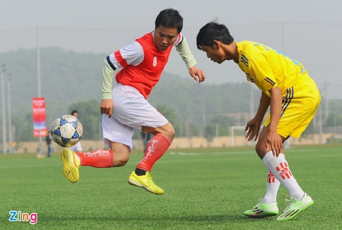 Hồng Sơn phô diễn kỹ thuật cá nhân trong một trận giao hữu trước sự trầm trồ của các đồng đội và khán giả hồi năm 2015. Ảnh: Minh Tùng.