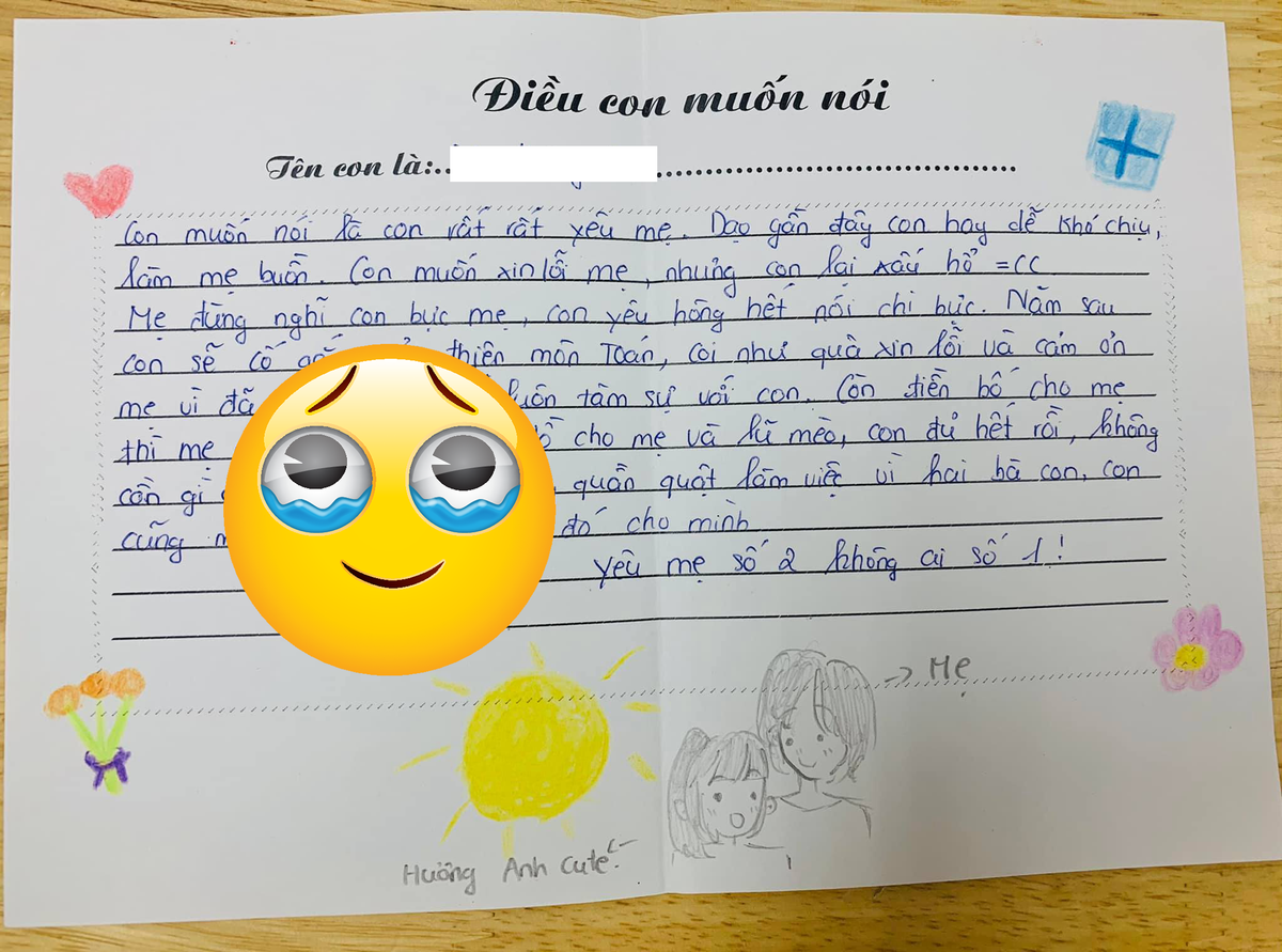 “Con muốn nói là con rất rất yêu mẹ. Dạo gần đây con hay khó chịu, làm mẹ buồn. Con muốn xin lỗi mẹ, nhưng con lại xấu hổ. Mẹ đừng nghĩ con bực mẹ, con yêu không hết nói chi bực. Năm sau con sẽ cố gắng cải thiện môn Toán, coi như lời xin lỗi và cảm ơn mẹ vì đã nuôi nấng và luôn tâm sự với con.