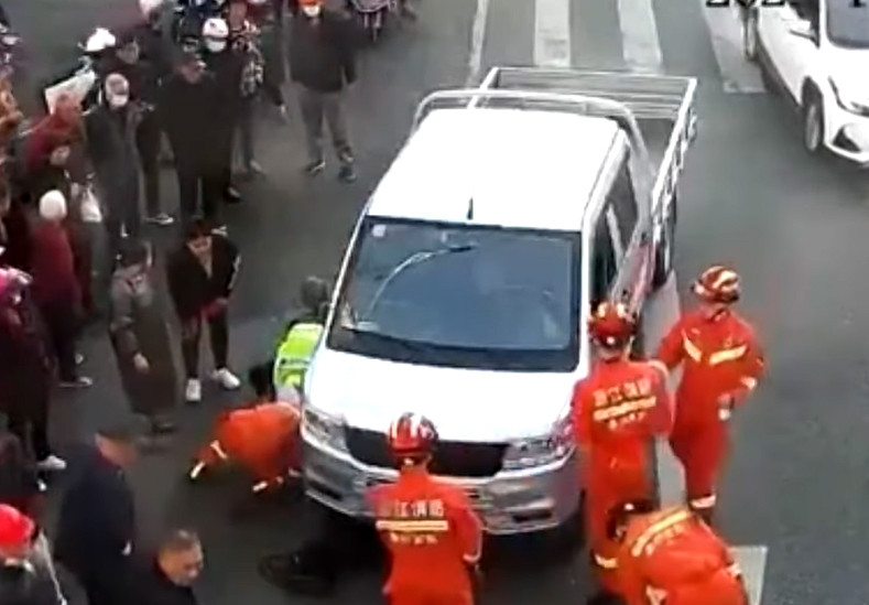 Hợp sức giải cứu người đàn ông mắc kẹt dưới gầm xe bán tải ở Trung Quốc