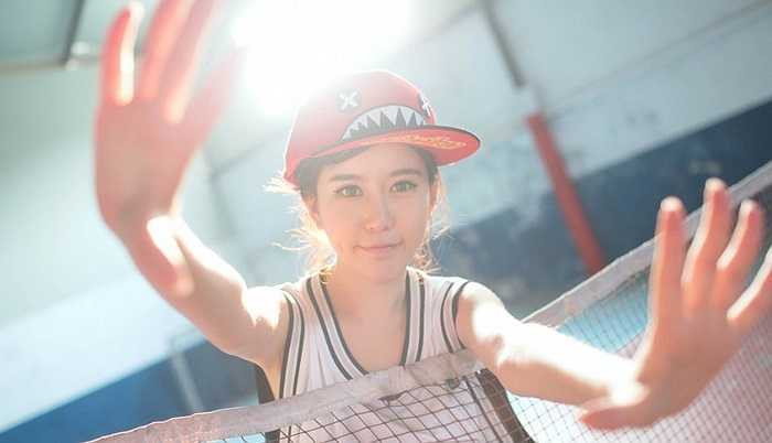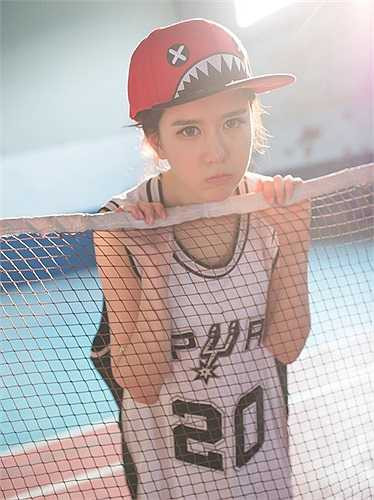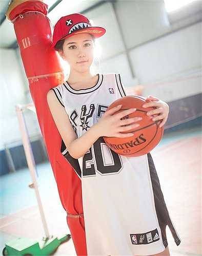 Hot girl bước ra sân trong một chiếc áo thùng, làm dáng bên trái bóng rổ.