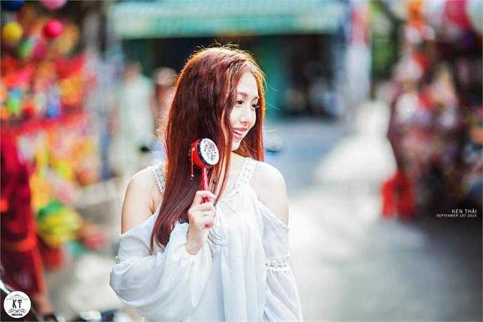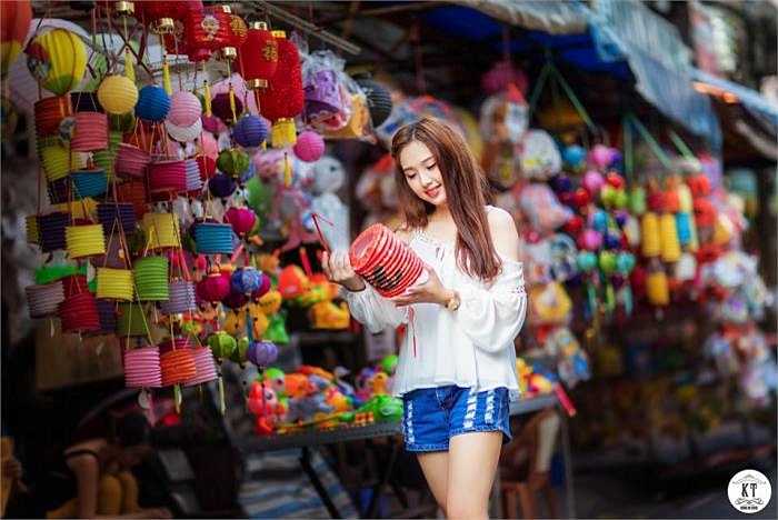 Hot girl Đại học Nguyễn Tất Thành Phạm Thái Thanh Thanh đẹp rạng ngời trên phố lồng đèn thu hút ánh nhìn của mọi người xung quanh.