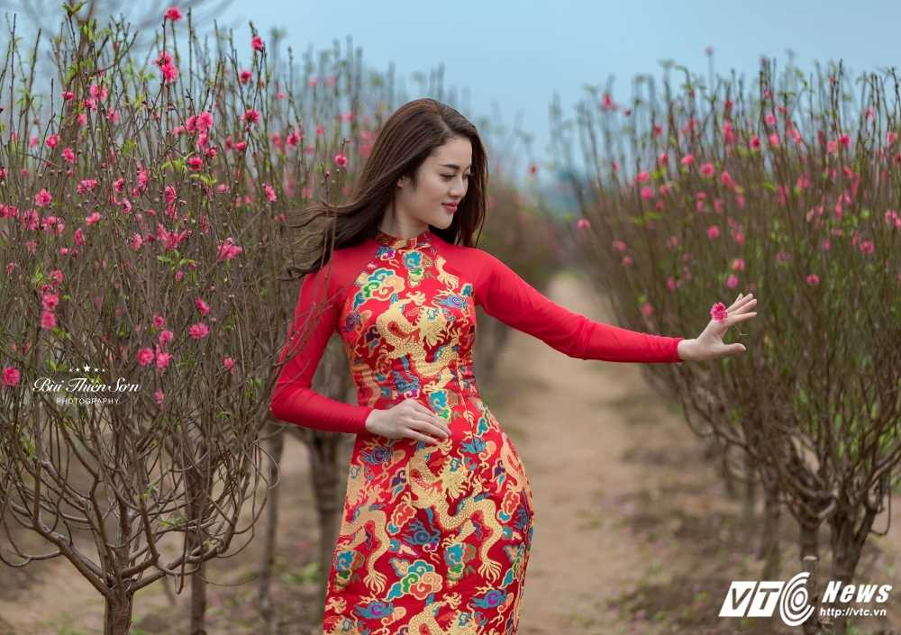 Hot girl Hà thành Vân Anh diện tà áo dài truyền thống khoe sắc bên đào xuân khiến cho không khí Tết trở nên ấp áp hơn.