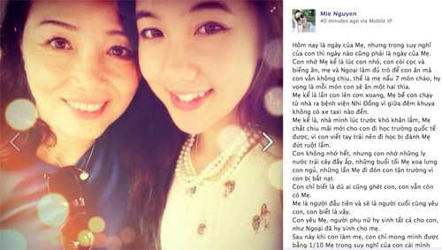 | Cô gái xinh đẹp, tài năng Mie Nguyễn với mẹ. Cô gái trẻ tâm sự khá dài trên trang cá nhân của mình: "Mẹ là người đầu tiên và sẽ là người cuối cùng yêu con, con biết vậy... Sau này, khi con làm mẹ, con chỉ mong mình được bằng 1/10 mẹ trong suy nghĩ của con cái mình". |