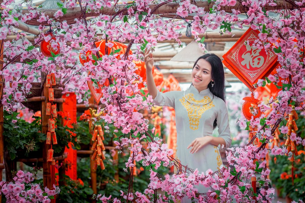 Diện áo dài thướt tha bên đào xuân, Nhi khiến người đối diện không thể rời mắt.