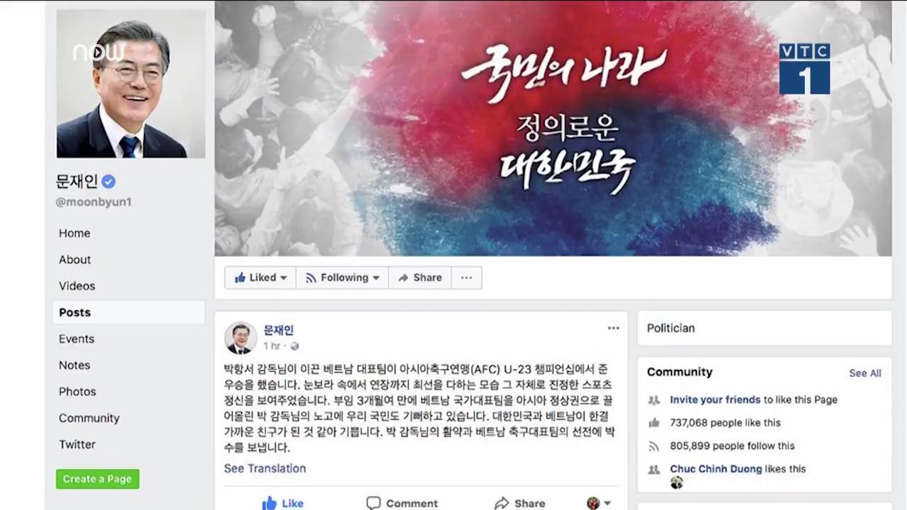 Tổng thống Hàn Quốc Moon Jae-in ca ngợi chiến công của U23 Việt Nam và HLV Park Hang Seo trên trang Facebook chính thức.