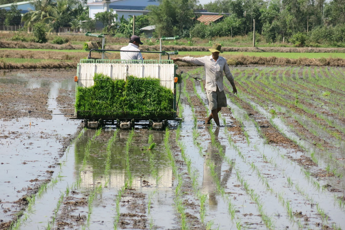 Thành viên HTX xuống giống lúa. (Ảnh: Nhi Trần)