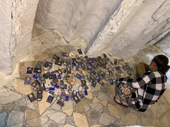 Nhiều bảng tên kèm ảnh người đã khuất bị bong ra khỏi hũ tro tại chùa Kỳ Quang 2. (Ảnh: M.T.H.)