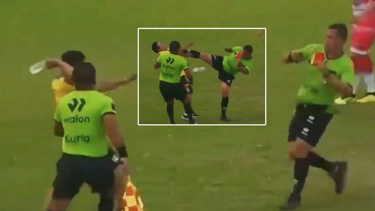 Trọng tài Luis Alegre thực hiện cú đá kungfu ngay trên sân