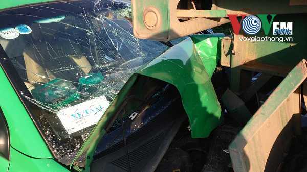 | Cú đâm mạnh khiến đầu xe taxi nát bét hư hỏng biến dạng nặng. Tài xế taxi bị thương nặng bất tỉnh bên trong xe. |