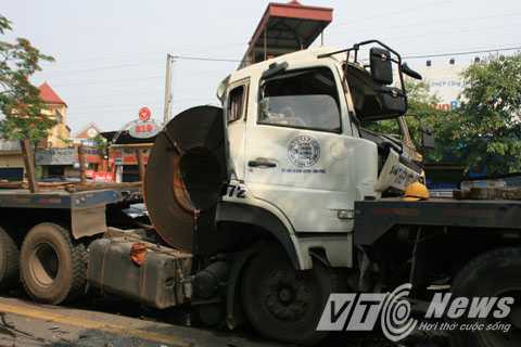 | Cuộn thép lá đứt dây chằng chèn qua thùng xăng xe đầu kéo, lái xe, phụ xe và lực lượng chắc năng phải kịp thời tháo rời khỏi xe đề phòng cháy nổ- Ảnh: MK |