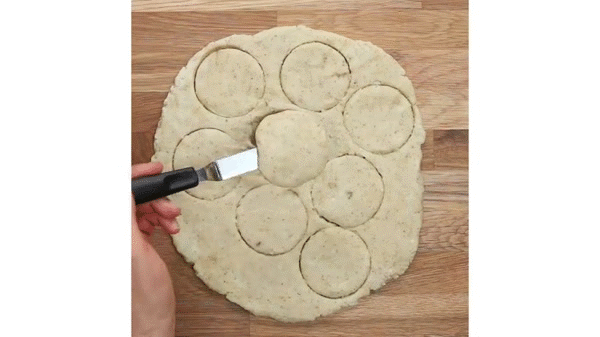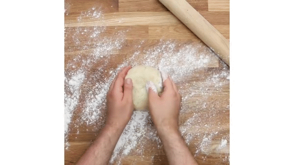 Bước 3: Rải một chút bột mì khô ra bàn, đặt bột vừa nhào lên rồi cán mỏng. Dùng khuôn hình tròn hoặc một chiếc nắp tròn để cắt bột thành những miếng nhỏ.