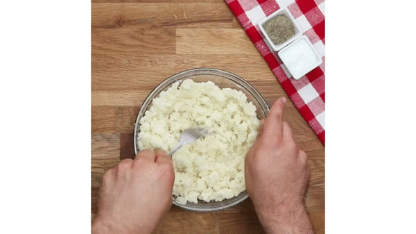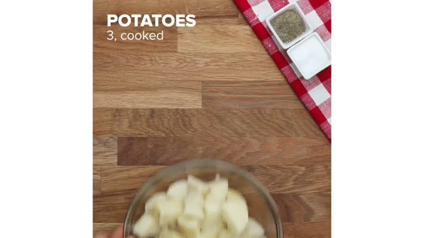 Bước 1: Khoai tây nạo vỏ, rửa sạch rồi luộc hoặc hấp chín. Sau đó cho khoai tây đã chín mềm vào một bát sạch, dùng thìa hoặc dĩa dầm khoai cho nhuyễn.