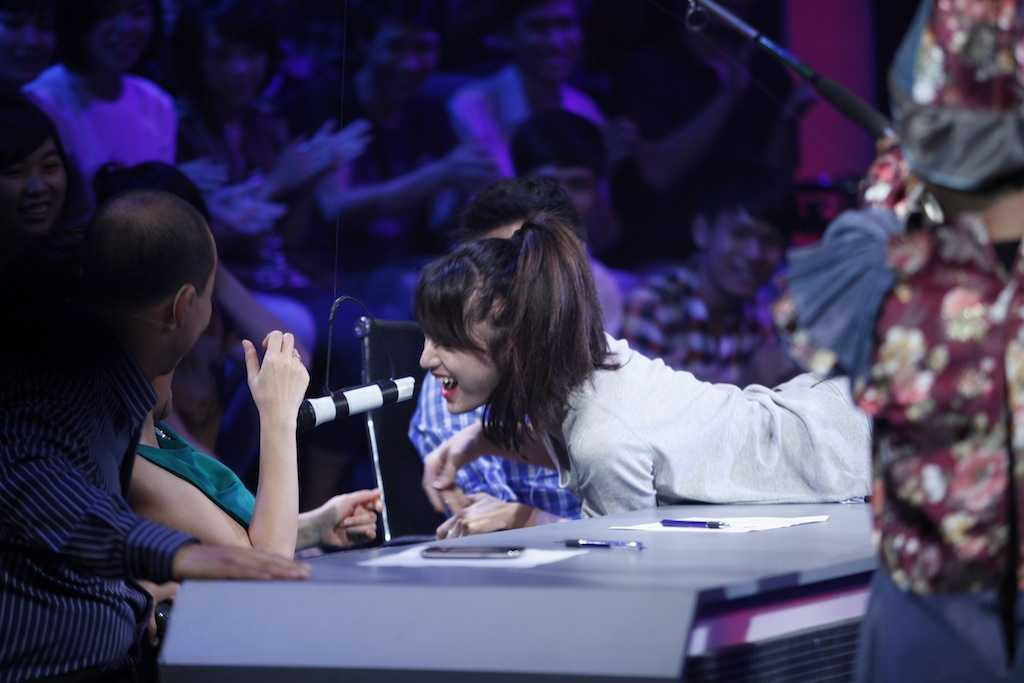 Hương Giang Idol đã phải bò trườn lên bàn của giám khảo để tranh giành micro.