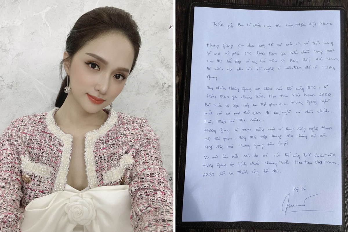 Trong bức thư tay, Hương Giang viết: "Hương Giang xin được cáo lỗi cùng ban tổ chức vì không tham gia chương trình Hoa hậu Việt Nam 2020. Bởi trước sự việc xảy ra thời gian qua, Hương Giang nghĩ mình cần thời gian suy nghĩ và điều chỉnh, hoàn thiện bản thân mình".