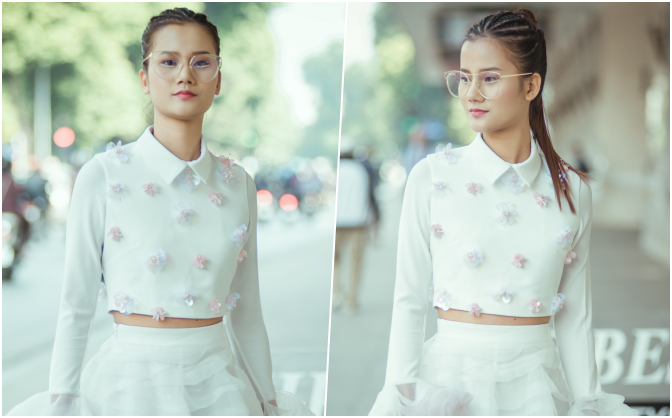 Quán quân Vietnam’s Next Top Model 2015 nổi bật trong ngày thứ 3 của hoạt động "street style" trong khuôn khổ của "Tuần lễ thời trang quốc tế Việt Nam Thu Đông 2017" khi kết hợp chiếc váy bèo nhún, áo tay xoè bồng với phụ kiện kính mát sắc màu và giày đế bằng tông bạc.