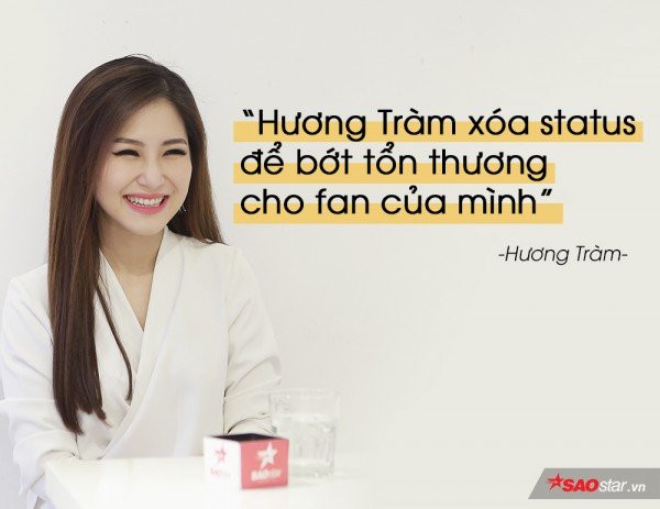 Cô nói thêm về việc xoá status ẩn ý trước đây: “Do Tràm sợ các bạn fan còn quá trẻ, nếu như mình định hướng không đúng các bạn sẽ dễ bốc đồng và bị kích động nên Tràm xoá đi để bớt tổn thương cho fan của mình. Tràm cũng không muốn họ phải lao vào giải thích những chuyện đó, vì tất cả mọi thứ đã rõ mười mươi rồi”.
