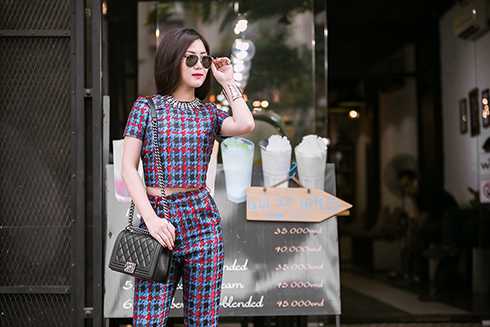 | Trang phục kết hợp đầy tinh tế giữa hàng hiệu và đồ thiết kế trong nước giúp Hương Tràm nổi bật trên phố. |