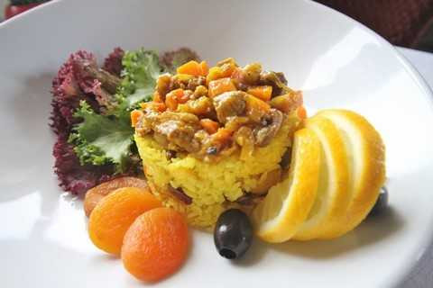 | Cơm Plop KavKaz trộn nấm, ăn kèm thịt xắt miếng om rau củ quả, món cơm còn có vị thơm dịu của nước sốt cam vàng ươm khiến thực khách như được đánh thức tất cả các giác quan |