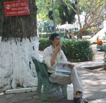 Tại bệnh viện Nhi Đồng 2, dù rằng đã giăng những tấm bảng tuyên truyền, kêu gọi ‘cấm hút thuốc lá’ trong bệnh viện, nhưng nhiều người vẫn vô tư hút thuốc trong bệnh viện.