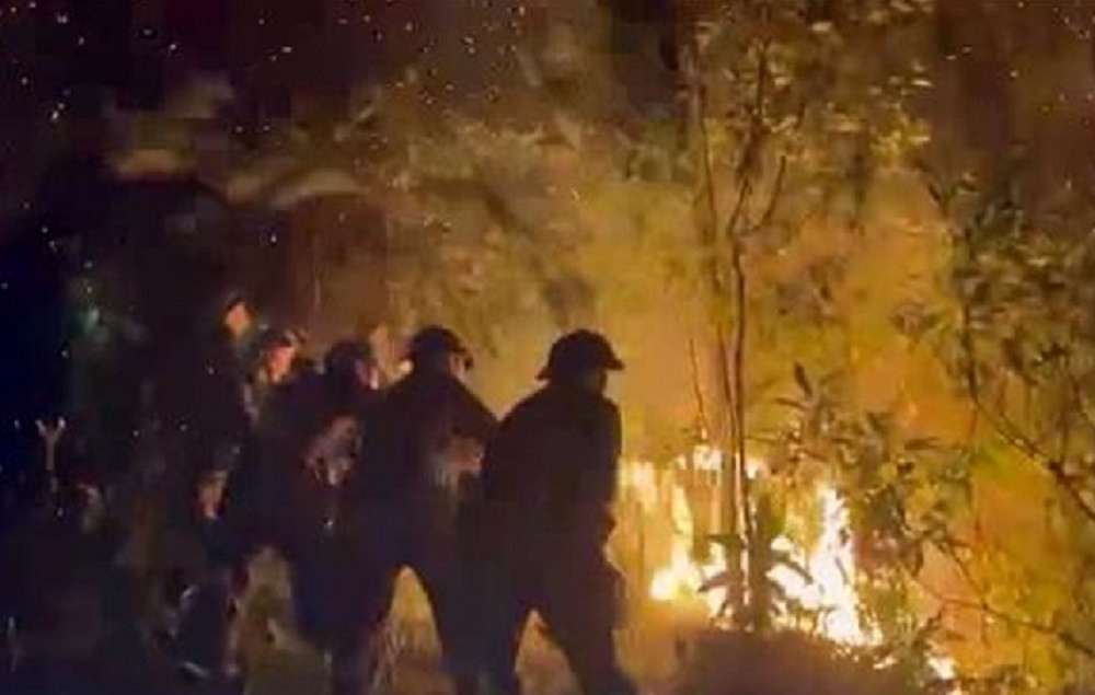 Đến 21h ngày 30/4, đám cháy vẫn chưa được khống chế, các lực lượng tham gia chữa cháy đang tập trung phát đường băng cản lửa, không để đám cháy lan rộng. (Ảnh: TTXVN phát)