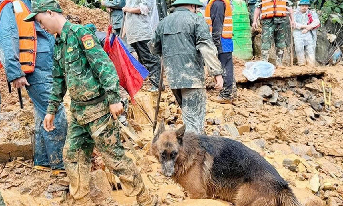 Chó nghiệp vụ được huy động tìm kiếm các nạn nhân. (Ảnh: Báo Tuyên Quang)