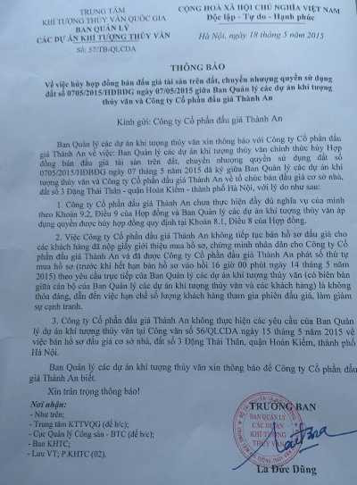 Thông báo trên được ông La Đức Dũng, Trưởng Ban Quản lý Các dự án Khí tượng thủy văn ký ngày 18/5/2015 gửi Công ty Cổ phần đấu giá Thành An.