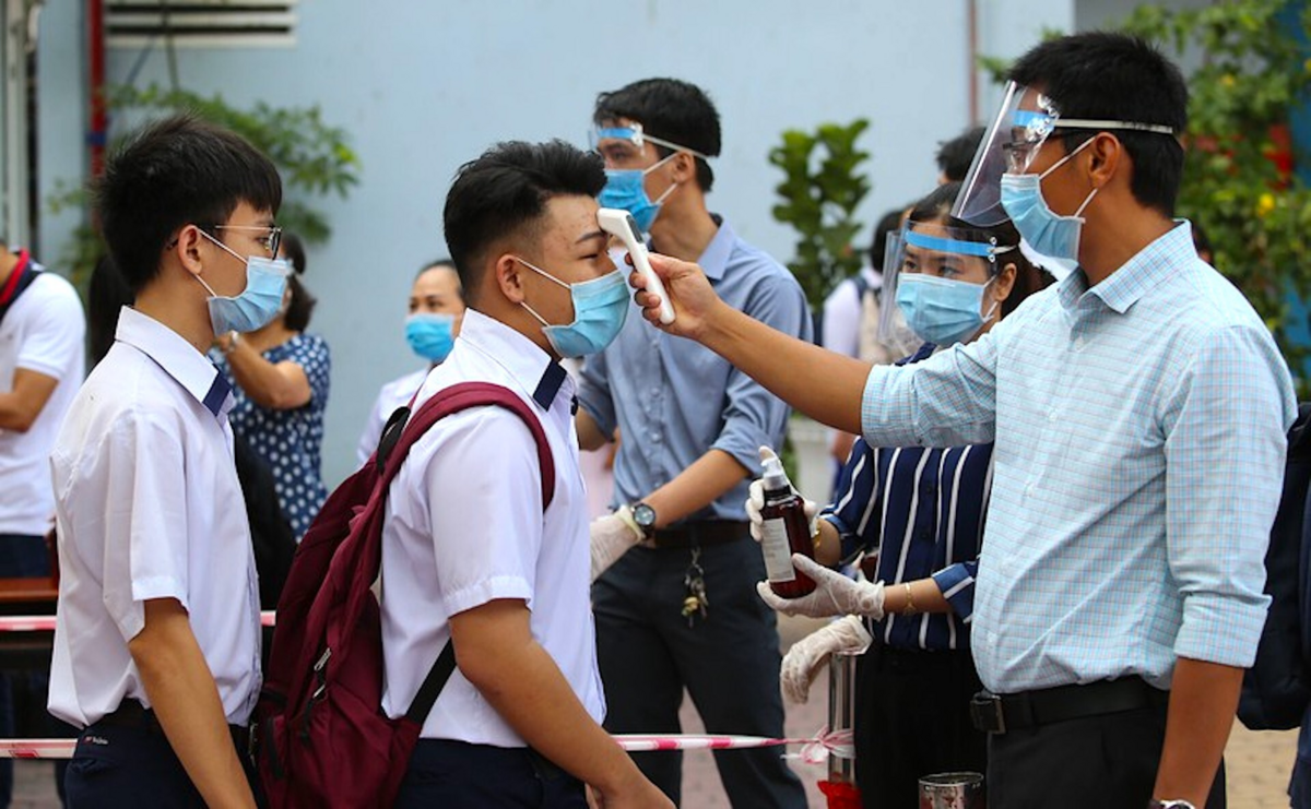 Đo thân nhiệt cho học sinh trước khi vào lớp. (Ảnh minh hoạ: G.L)