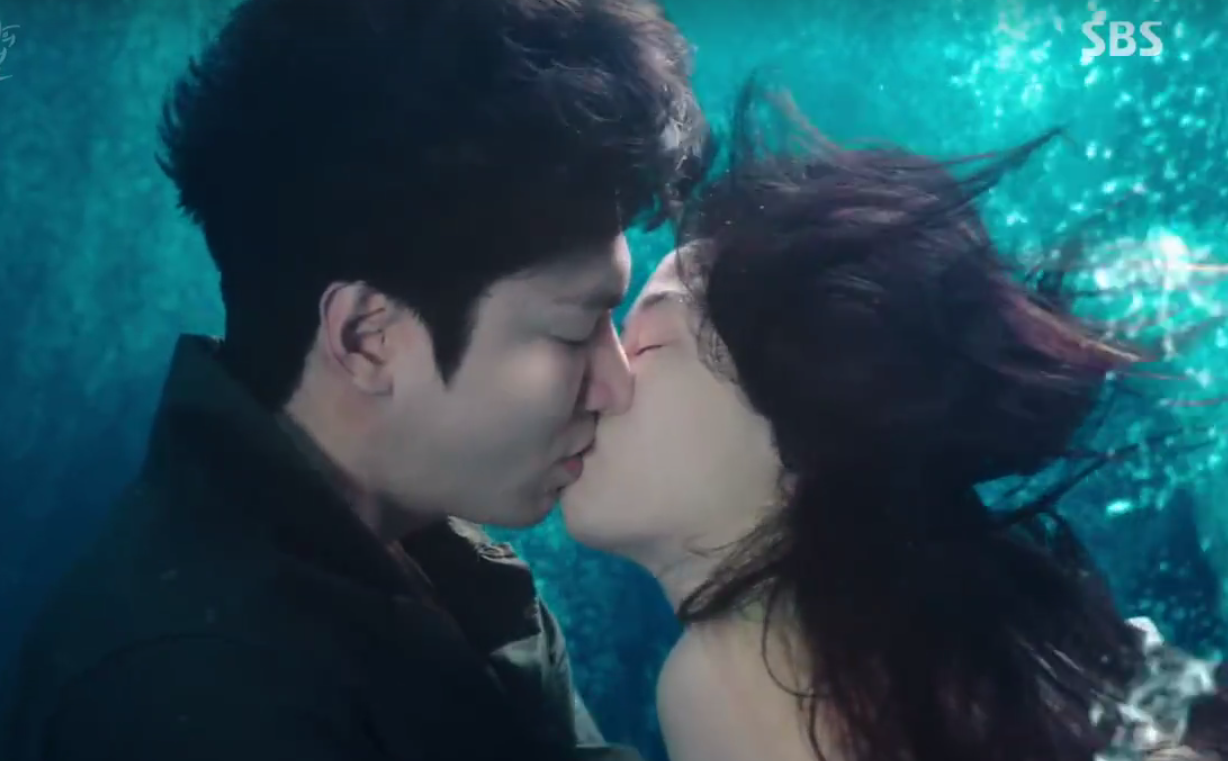 Cuối tập 2 Huyền thoại biển xanh, cả hai tiếp tục bị truy đuổi đến đường cùng - một vách đá cheo leo giữa biển. Shim Chung không còn cách nào khác là đẩy Joo Jae xuống nước và hóa thân thành nàng tiên cá cứu ân nhân. Và giữa biển xanh mênh mông, họ đã có nụ hôn đầu tiên.