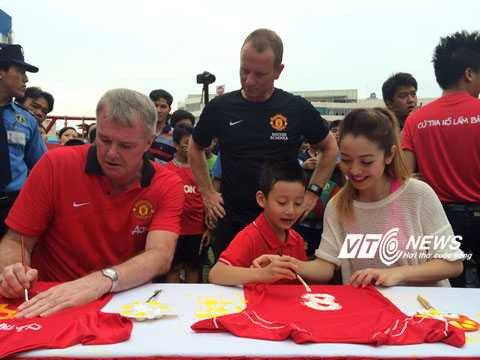 | Người đẹp Jennifer Phạm cùng con trai Bảo Nam và huyền thoại Gary Pallister vẽ số áo cầu thủ mình ưa thích. Ảnh: Huy Phan |