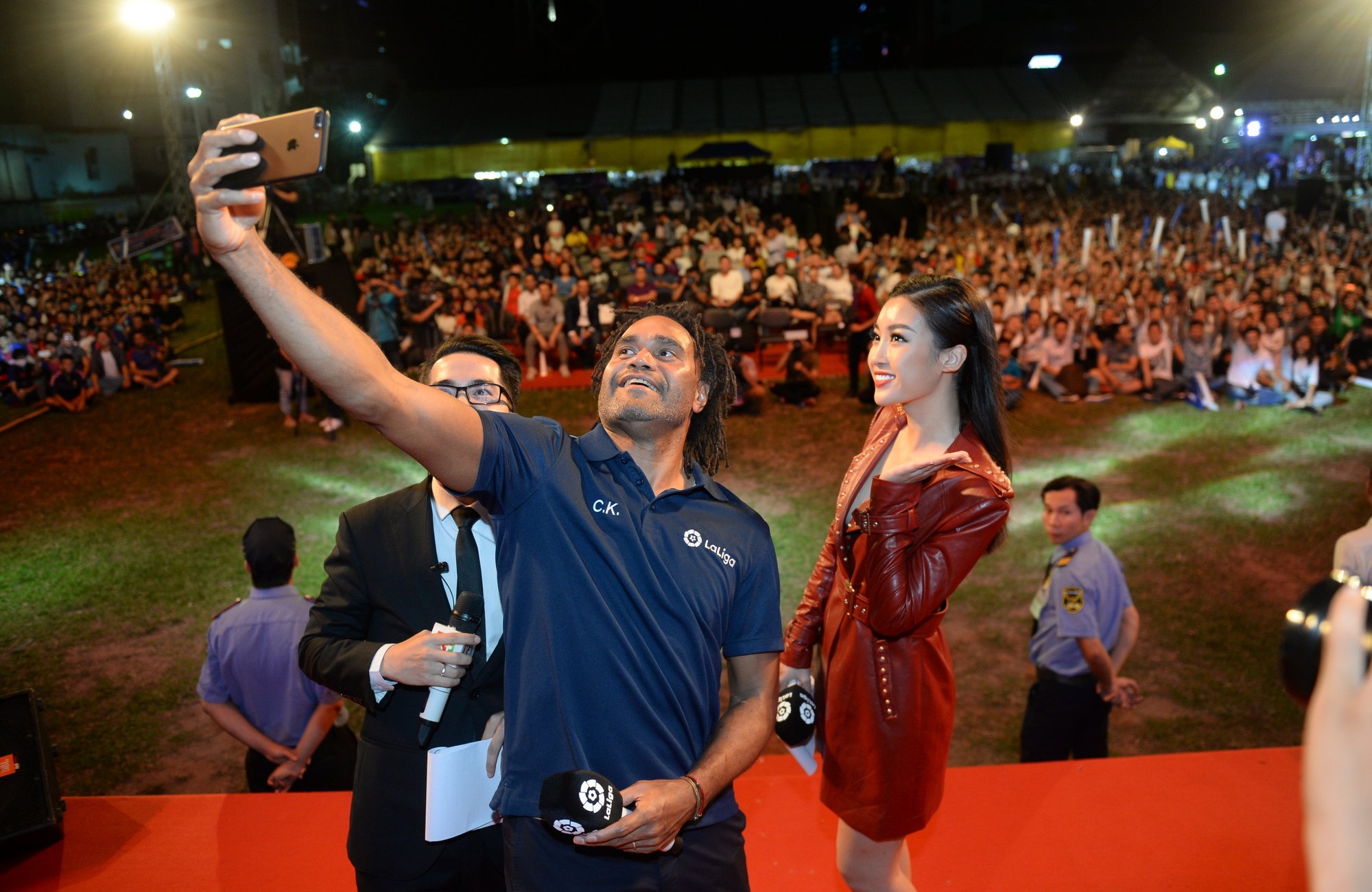 Cựu danh thủ Christian Karembeu selfie cùng Hoa hậu Đỗ Mỹ Linh và gần 10.000 CĐV của Real Madrid lẫn Barcelona có mặt trên sân vận động Hoa Lư (TP HCM) để "tiếp lửa" trận siêu kinh điển tối 23/12.
