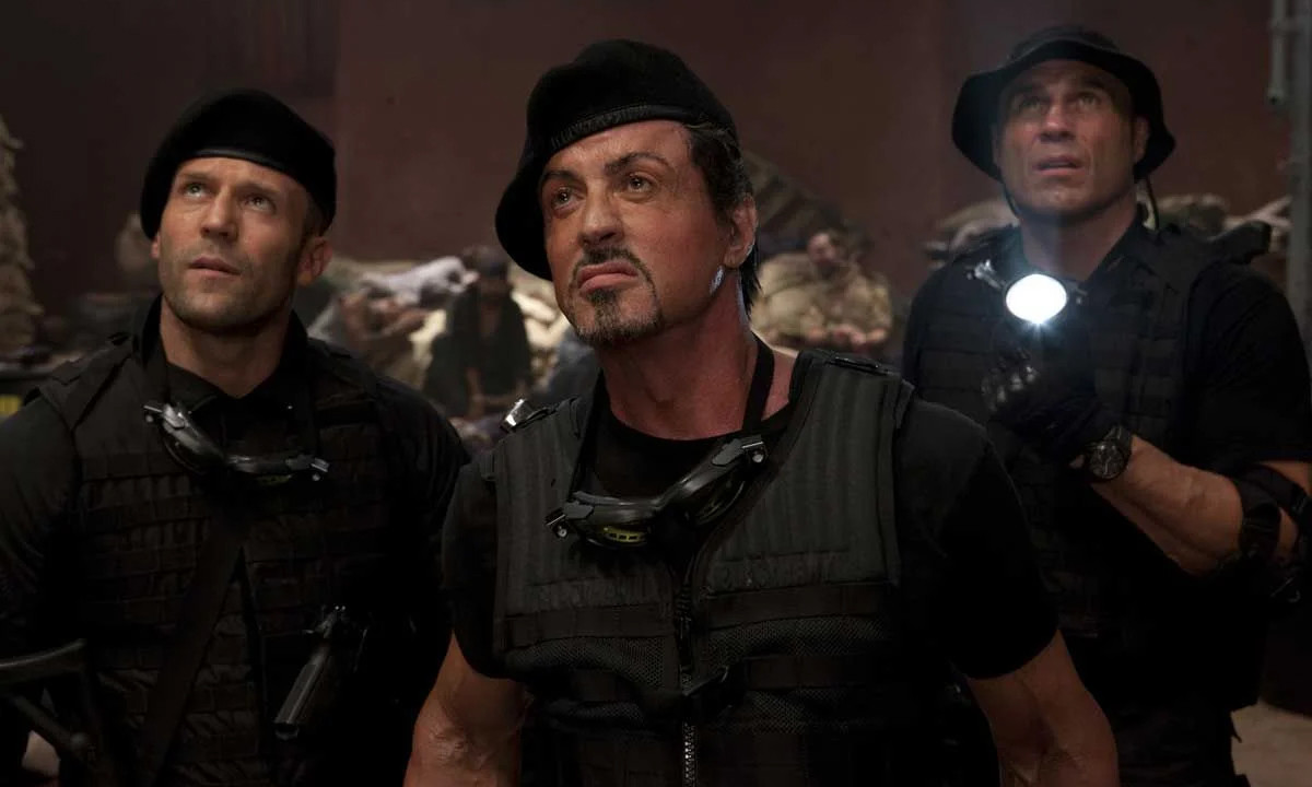 Randy Couture (bên phải) trong một cảnh quay cùng Jason Statham và Sylvester Stallone.