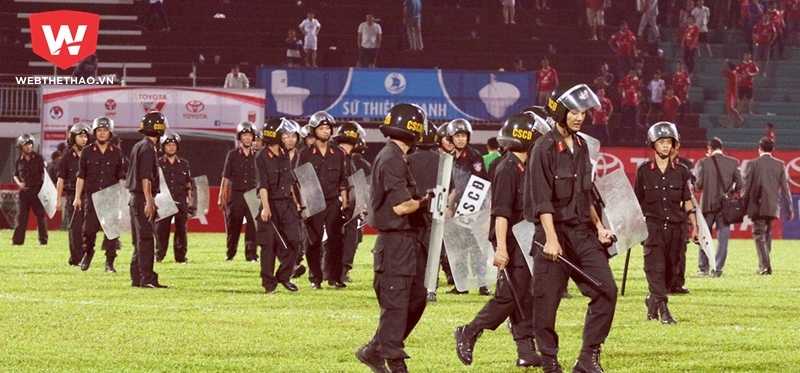 Trước không khí căng thẳng, gần trăm chiến sỹ cơ động phải xuống sân để bảo vệ tổ trọng tài gồm trọng tài chính Nguyễn Minh Trí, trợ lý 1 Lê Ngọc Ân, trợ lý 2 Nguyễn Ngọc Minh, trọng tài thứ 4 Nguyễn Hiền Triết, giám sát trận đấu Lê Hữu Tường, giám sát trọng tài Bùi Như Đức, điều phối viên Trần Phi Hùng.