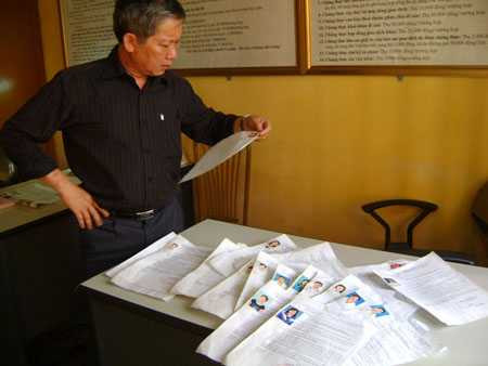 | Cán bộ tư pháp xã Phả Lễ, Thủy Nguyên bên chồng hồ sơ các cô gái làm thủ tục lấy chồng nước ngoài. |