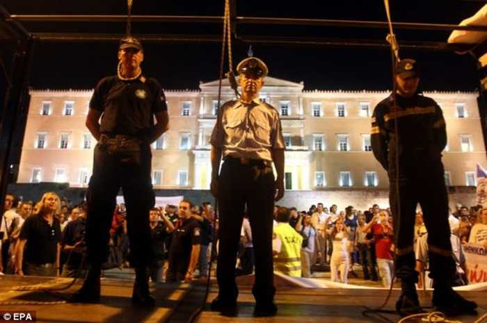 (VTC News) – Một số nhân viên an ninh người Hy Lạp đã dàn dựng màn treo cổ tập thể ngay phía trước tòa nhà nghị viện ở thủ đô Athen nhằm biểu tình phản đối các biện pháp thắt lưng buộc bụng của chính phủ khi tình hình nợ công đang ngày càng nghiêm trọng, theo Daily Mail hôm 6/9.