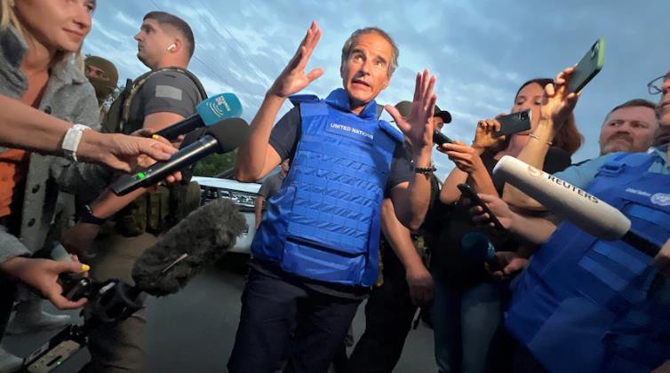 Tổng giám đốc IAEA Rafael Grossi trả lời báo giới khi tới thăm nhà máy Zaporizhzhia. (Ảnh: Reuters).
