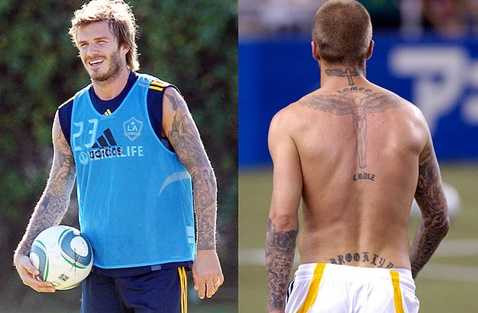 Đầu tiên là dòng chữ "Brooklyn" dưới lưng.Đó là là tên cậu con trai cả của Beckham, ra đời vào năm 1999 và cũng là hình xăm đầu tiên của Becks. Tên cậu con trai thứ hai Romeo được anh xăm trên đôi cánh của Thiên thần hộ mệnh, vốn là hình xăm được anh tin là thứ bảo vệ cho gia đình.