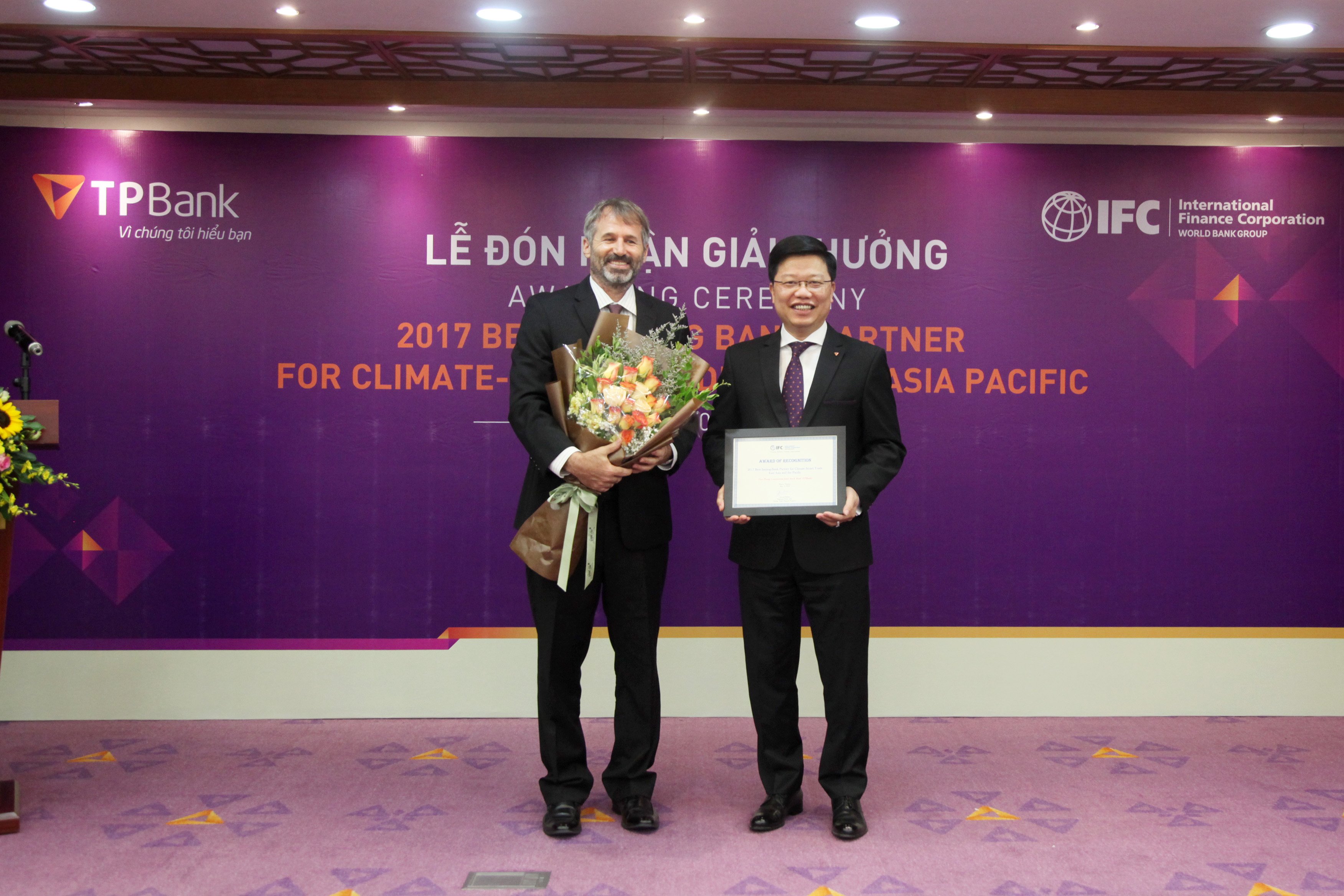 Chiều 21/5/2018, tại Ngân hàng TMCP Tiên Phong (TPBank), Ông Kyle Kelholfer, Giám đốc Quốc gia phụ trách Việt Nam, Cam-pu-chia và Lào, đại diện Tổ chức Tài chính Quốc tế IFC đã trao giải thưởng “Ngân hàng phát hành tốt nhất 2017 về lĩnh vực Tài trợ Thương mại cho các dự án thích ứng biến đổi khí hậu thông minh Khu vực Đông Á – Thái Bình Dương” cho TPBank. Được biết, năm nay, Việt Nam chỉ có 4 ngân hàng vinh dự được IFC trao tặng giải thưởng.