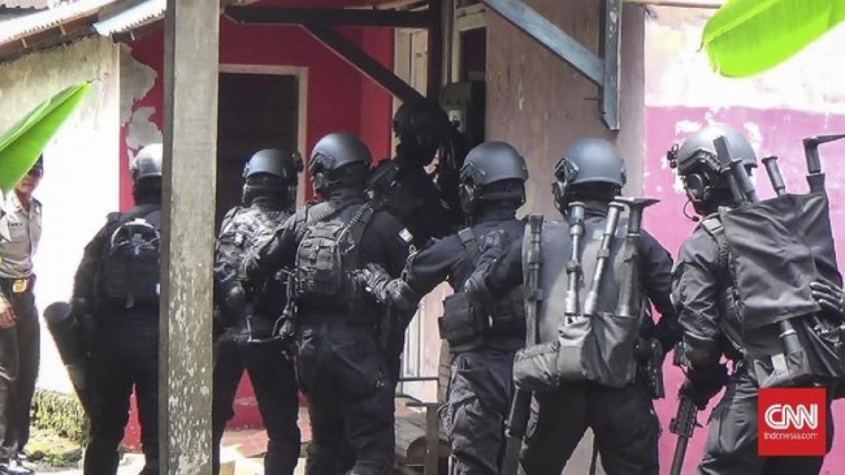 Densus88 vây ráp nghi phạm khủng bố. (Ảnh: CNN Indonesia)