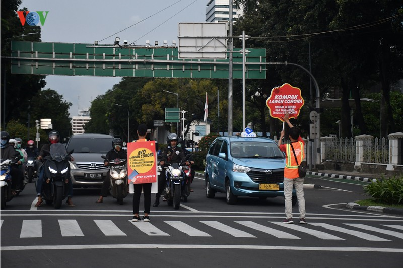 Indonesia tuyên truyền người dân giữ khoảng cách xã hội để chống Covid-19.