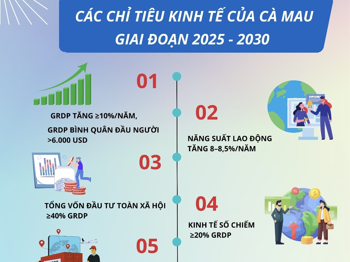 (VTC News) - Cà Mau đề ra 22 chỉ tiêu then chốt giai đoạn 2025 - 2030, hướng tới tăng trưởng GRDP trên 10%/năm, phát triển xanh, bền vững và trở thành cực tăng trưởng của vùng.