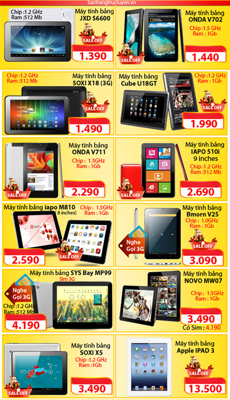 Ngoài ra còn hàng loạt các sản phẩm máy tính bảng giá cực hấp dẫn. Cấu hình cao, màn hình HD, hỗ trợ 3G, wifi giá chỉ từ 1.390.000đ.