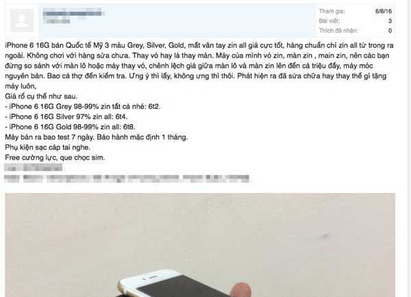 Cụ thể, iPhone 6 16GB “mất vân tay” được rao giá từ 6,2 - 6,8 triệu đồng, tùy màu sắc và độ mới. Có nơi rao giá chỉ 5.350.000 đồng đến 5.750.000 đồng. Phiên bản màu vàng (gold) thường được rao giá đắt nhất, kế đến là bản màu bạc, rẻ nhất là màu xám.