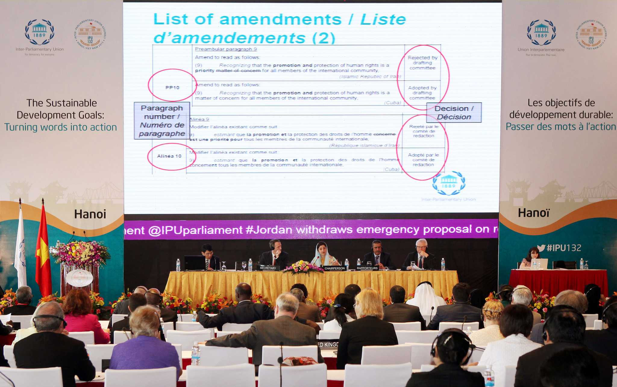 Dự thảo Nghị quyết này đã được soạn thảo từ IPU-131 nhưng do còn ý kiến khác nhau nên chưa thông qua được. Đây cũng là một trong những nội dung quan trọng bậc nhất được bàn thảo và thông qua tại hội nghị IPU 132 tại Việt Nam.