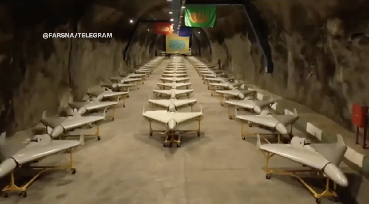 Video do hãng thông tấn nhà nước Iran Fars News Agency công bố cho thấy hàng loạt máy bay không người lái xếp hàng dài trong đường hầm ngầm, hoặc được chất lên bệ phóng tên lửa. Quốc kỳ Iran và hình ảnh của cố Lãnh đạo Tối cao Ayatollah Ali Khamenei được treo trên các bức tường.