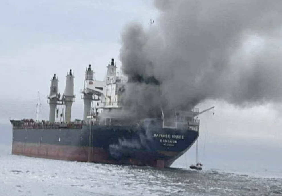 Tàu chở hàng Mayuree Naree treo cờ Thái Lan bốc khói đen dày đặc tại eo biển Hormuz. (Nguồn: Reuters)