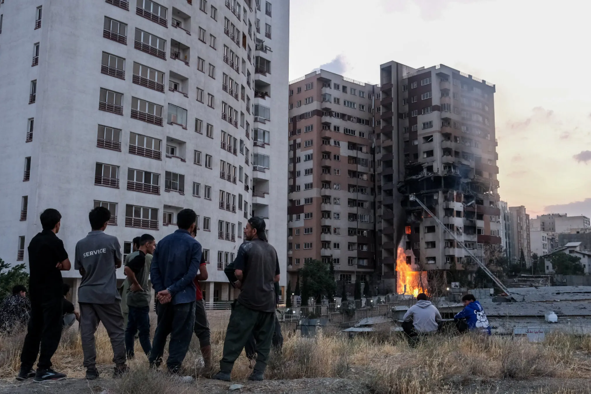 Người dân Iran xung quanh một tòa nhà bị trúng tên lửa của Israel. (Ảnh: Getty)