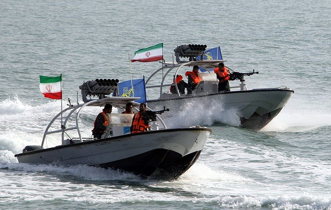 Xuồng cao tốc của Vệ binh Cách mạng Hồi giáo Iran xuất hiện gần một tàu chở dầu trên vịnh Ba Tư. (Ảnh: AP)